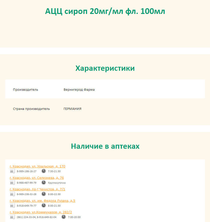 Пример онлайн-витрины можно найти у региональной аптечной сети Краснодарского края «Здоровье». На сайте организован каталог и поиск. В них можно отыскать нужное лекарство и узнать адреса, где оно в наличии.