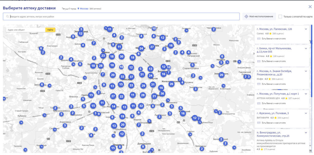 Покупатель может выбрать нужную аптеку по названию и адресу или по карте. Это можно сделать сразу при заходе на сайт, во время ознакомления с товаром или оформления заказа.
