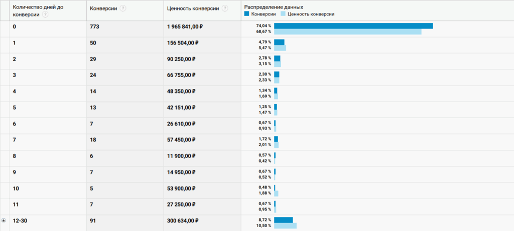 На скрине ниже статистика интернет-магазина, которая показывает, что в день первого визита совершается 74,04% продаж, которые приносят 68,67% дохода.