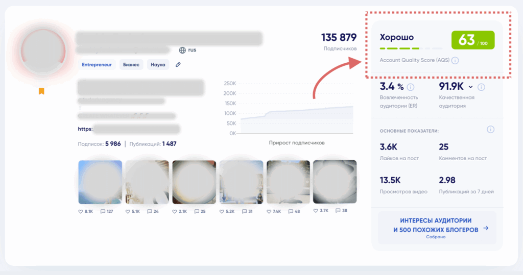 На основе анализа сервис присваивает аккаунтам оценку Account Quality Score (AQS). Высокий коэффициент говорит, что у блогера живая аудитория, интересный контент, а свой аккаунт он продвигает разрешенными методами.