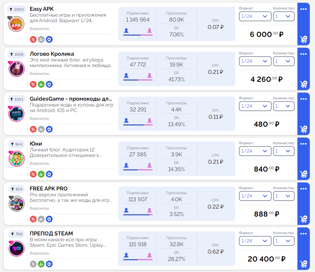 На момент написание статьи в каталоге биржи присутствует почти 13 тыс. каналов. Их можно фильтровать по тематике , подписчикам, ER, CPV и др. параметрам. Также в каталоге сразу видна стоимость рекламы в зависимости от формата размещения.