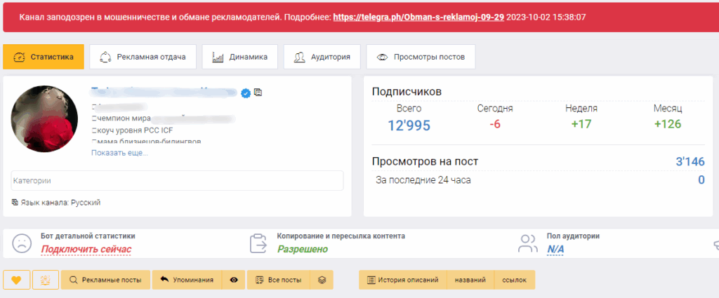 Если нажать на название канала, откроется его детальная статистика. В ней можно видеть, как менялось число подписчиков, кто кого упоминал, сколько просмотров набирают посты, охват, ER, количество постов, в т. ч. и рекламных.