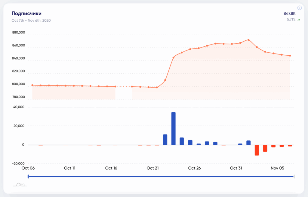 Сервис отслеживает основные показатели, такие как прирост подписчиков, изменения ER, упоминания. Это позволяет видеть, как рекламируется аккаунт. Например, колебания вовлеченности и роста аудитории позволяют выявлять накрутку подписчиков и гивы. Резкий рост подписчиков с последующим спадом указывает на то, что в аккаунт пришли боты или призоловы, которые затем отписались. У блогера, который использует подобные методы продвижения, может быть нецелевая или неживая аудитория, поэтому не стоит покупать у него рекламу.