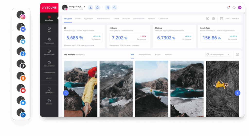 LiveDune — сервис для комплексной работы с социальными сетями. Он собирает статистику по аккаунтам, измеряет KPI и занимается автопостингом. Площадка работает со всеми популярными соцсетями, включая Одноклассники и TikTok.