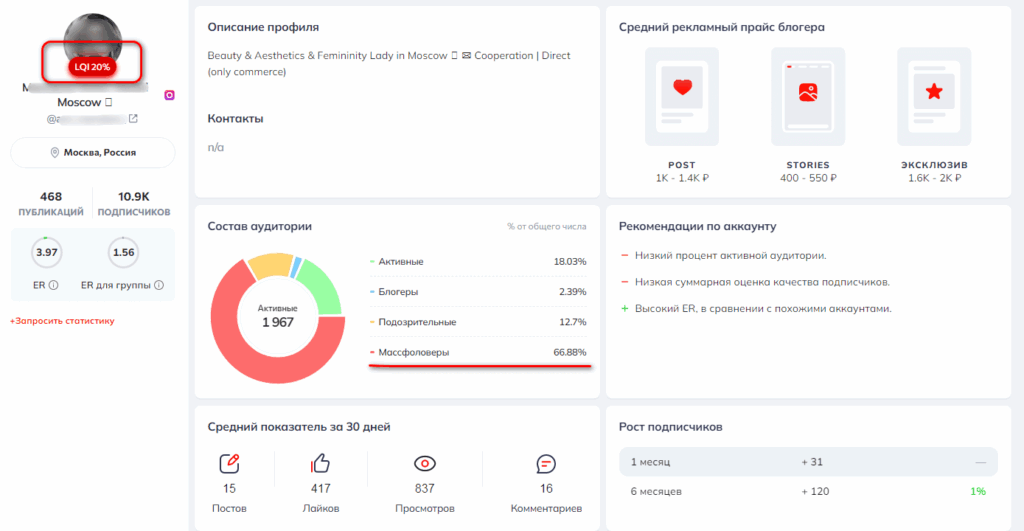 Для быстрого анализа качества аккаунтов LebelUp использует оценку LQI. Хорошим показателем считается отметка в 76 пунктов, выше среднего — от 51. Оценка в 50 и ниже говорит о плохом качестве аудитории. Снижают LQI накрутка, массфолловинг и гивы.
