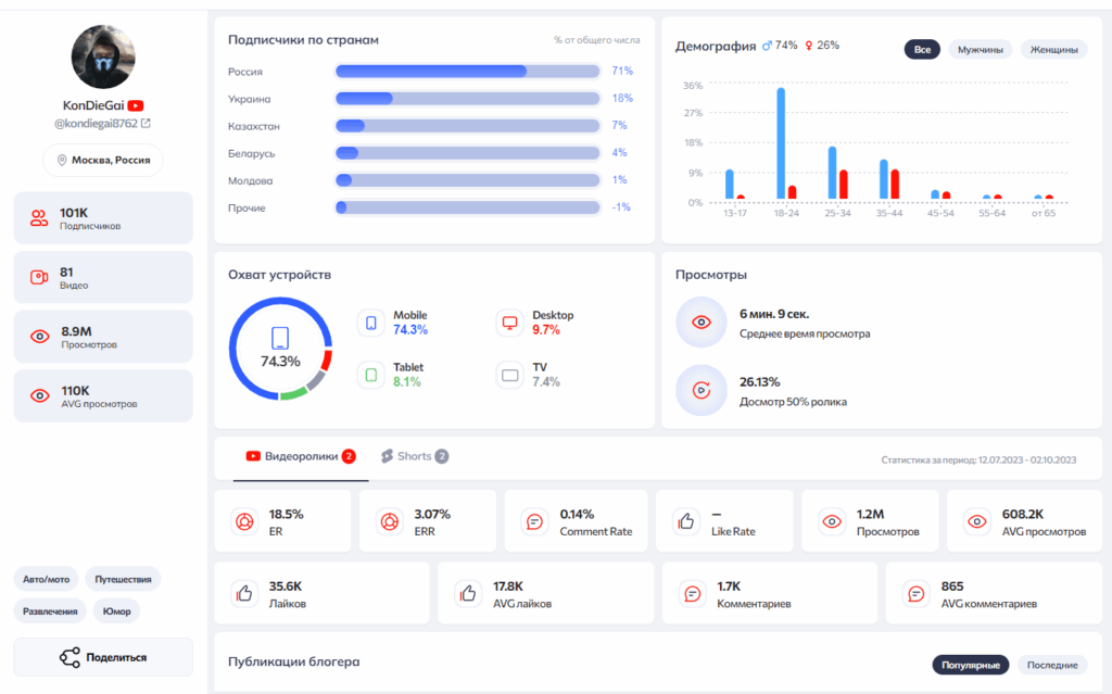 Если нажать на название канала, откроется его карточка с полной статистикой. В ней отражаются частота публикации контента, кол-во лайков и просмотров, вовлеченность и др. Также есть список брендов, которые были упомянуты на канале.