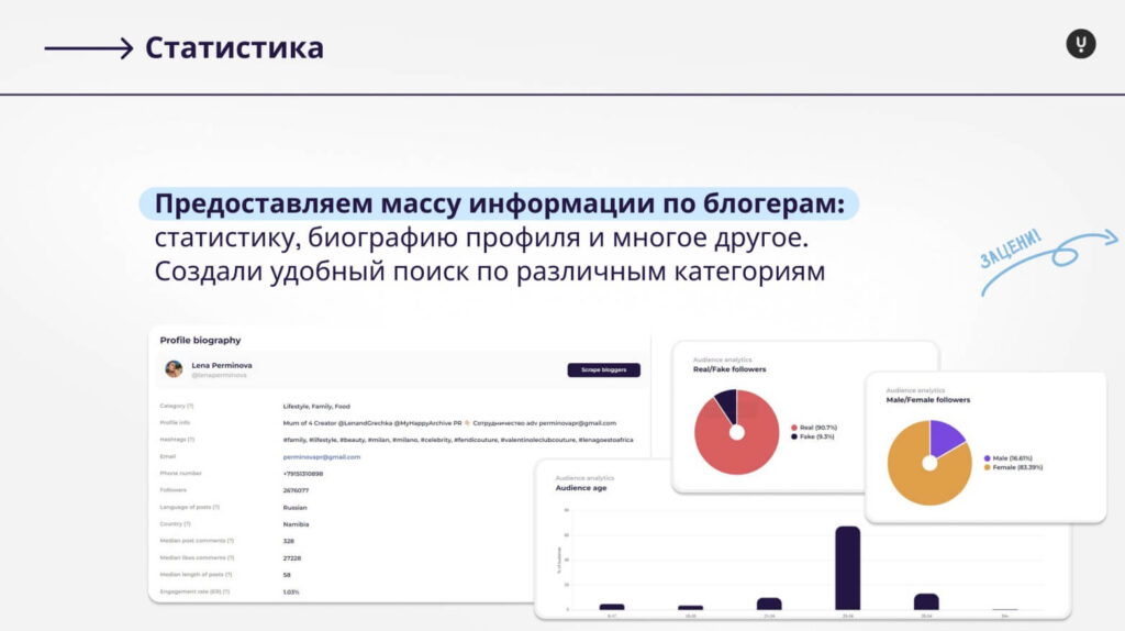 Сервис позволяет анализировать блогеров по многим критериям, включая количество подписчиков, подписок, страну, хештеги блогера, ER, тематику, определять медиану по лайкам, комментариям и символам в постах.