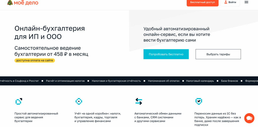 | Базовый | от 458 | Отчётность в ФНС и Росстат, расчёт налогов, налоговый календарь, поддержка 24/7 |
