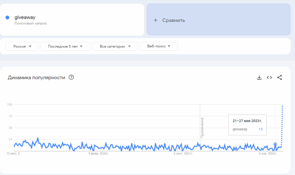 Согласно Google Trends, который анализирует текущие тренды в интернете, популярность Giveaway в России в 2023 г. остается примерно на таком же уровне, что и в 2021 г. и ранее. Это значит, что конкурсы все так же интересны аудитории и они используются блогерами и компаниями для продвижения.