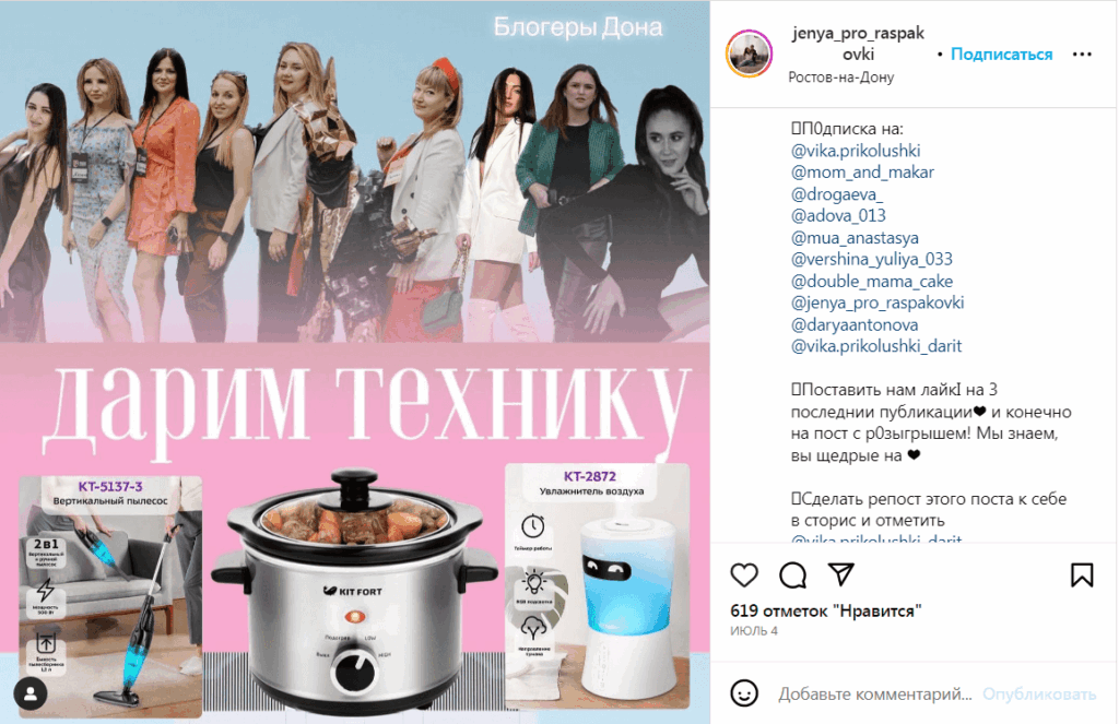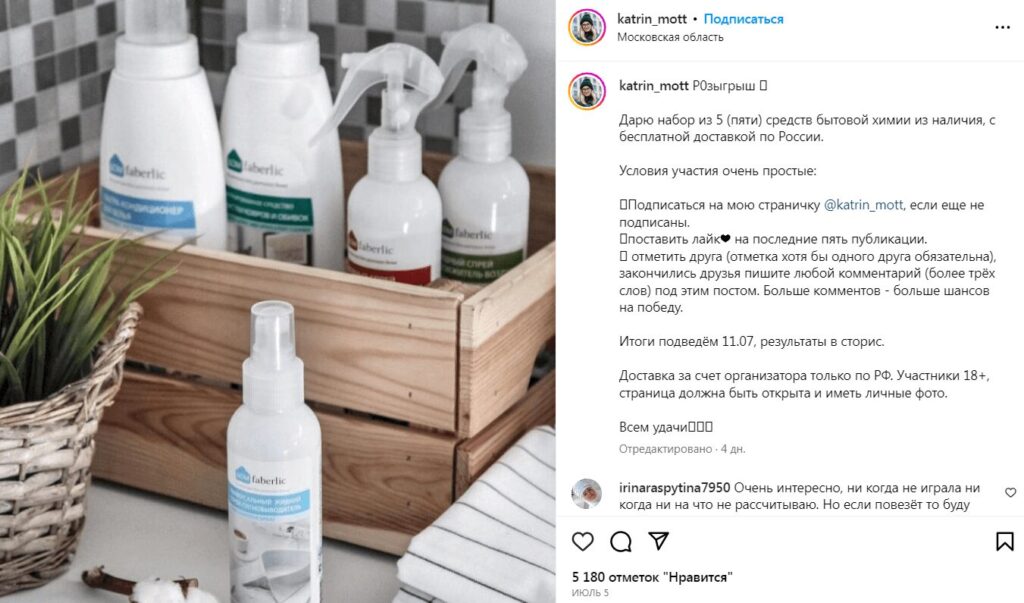 Владелец аккаунта проводит конкурс внутри своего блога. Зачастую призом служит продукция, которая продается в профиле: товар, книга, услуга и пр. Для участия в розыгрыше требуется стать подписчиком аккаунта, поставить лайк посту с конкурсом и отметить друга через @. Иногда организатор просит поставить лайк 5 постам, а также сделать репост в сториз. Такие конкурсы не требуют больших вложений, так как из расходов — только сам приз.