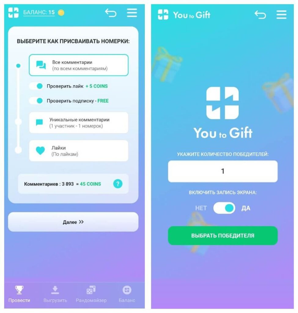 У You to Gift есть веб-версия и мобильное приложение для iOS и Android. При скачивании последнего предоставляются 40 монет, которых хватит на оплату одного или нескольких небольших конкурсов. У сервиса гибкая тарификация, стоимость зависит от количества комментариев, лайков и подписчиков.