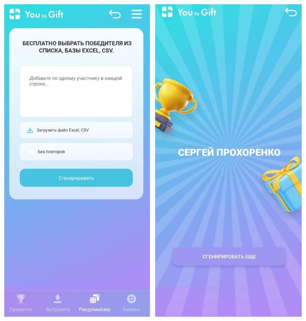 У You to Gif есть бесплатный рандомайзер. Он генерирует случайное число, по которому определяется победитель. Если у вас есть выгруженный список участников, вы можете загрузить его в сервис, и тот бесплатно выберет победителя. Можно загружать не только логины, но и имена, номера телефонов и другую информацию.