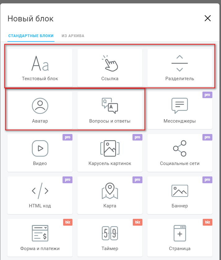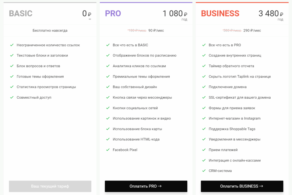 У сервиса три тарифных плана. В бесплатном немного вариантов для оформления: имеется возможность вставить несколько ссылок на сайт или на номер телефона, а также добавить текстовые блоки, разделители и аватар. Ссылки на другие сети, мессенджеры и др. опции – в платном тарифе. Что в них входит – смотрите ниже: