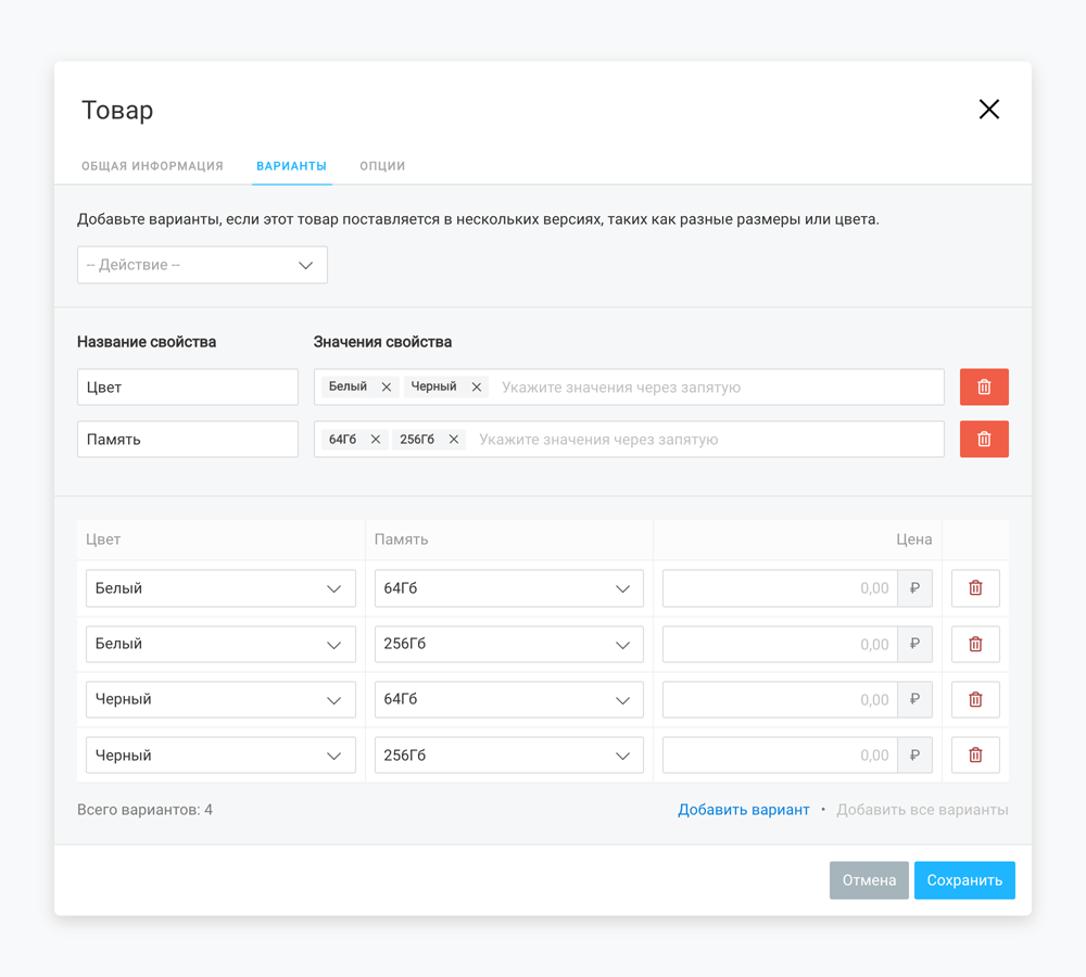К товару можно добавить варианты (цвет, размер и др.) и назначить для каждого стоимость. Если есть сопутствующие, их следует привязать к основному ассортименту.