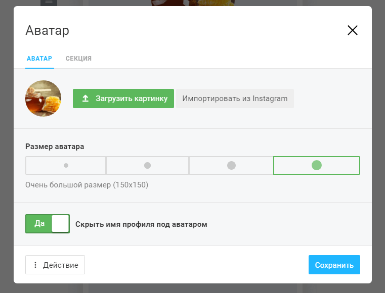 Итак, для начала установим аватар, нажав на пустой кружок. Загрузить фото можно с ПК или из профиля Инстаграма. Доступны 4 размера фото.
