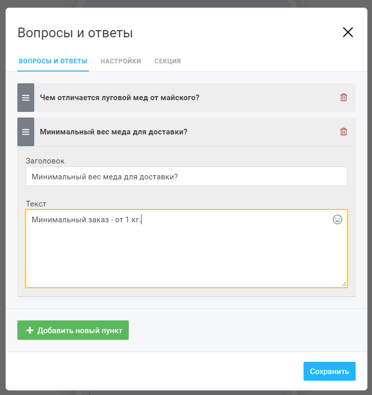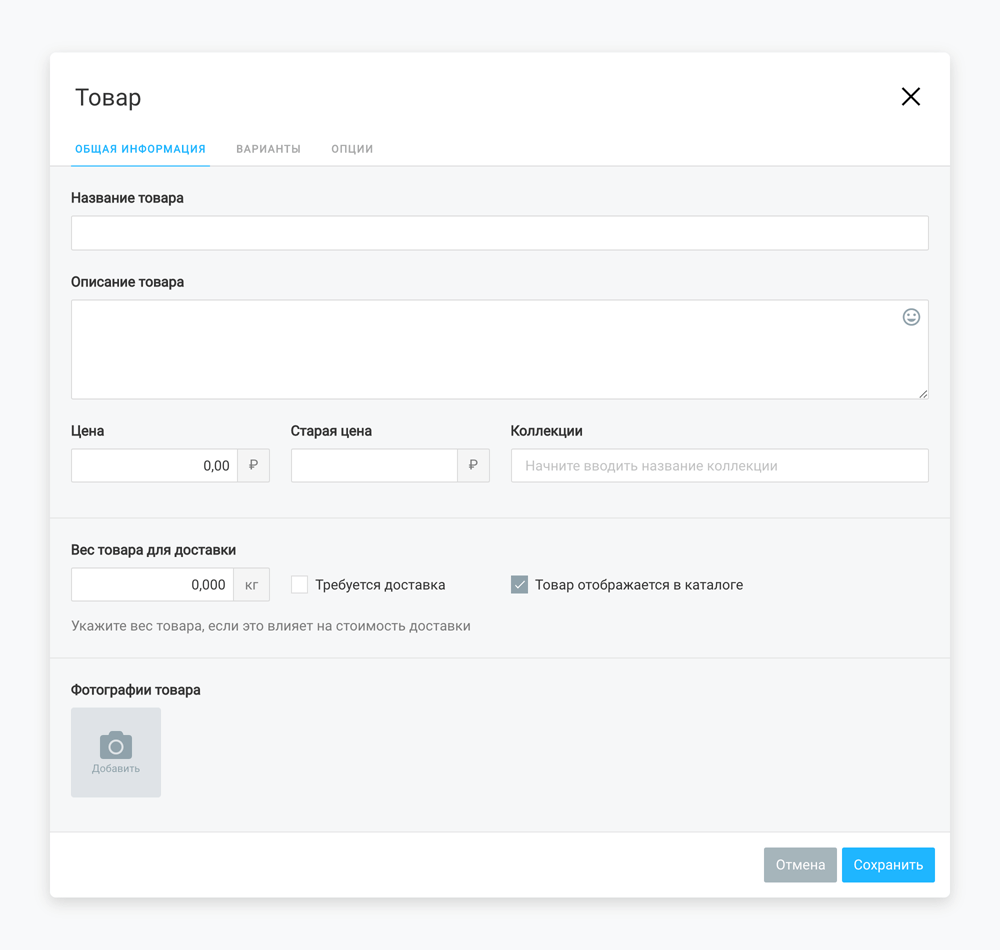В него есть возможность добавить название, фото, цену новую и старую. Если товар требует доставки, система попросит клиента данные для нее.
