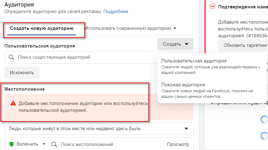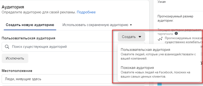 Соцсеть может собрать аудиторию автоматически, но она не будет точной. И точно не стоит выбирать такой способ, если ваш бизнес имеет географическую привязку. Поэтому выбирайте последний пункт «Создать свою аудиторию».