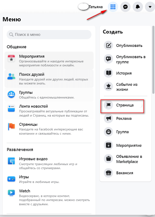 Для этого в правом окне вашей личной странички жмем на «Меню», а затем на «Страница».