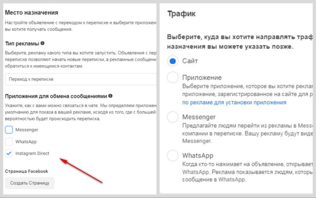 В зависимости от цели, вам будет предложено выбрать, куда направить пользователя: на сайт, в Директ, в мессенджеры и др. Выберите подходящий вариант.