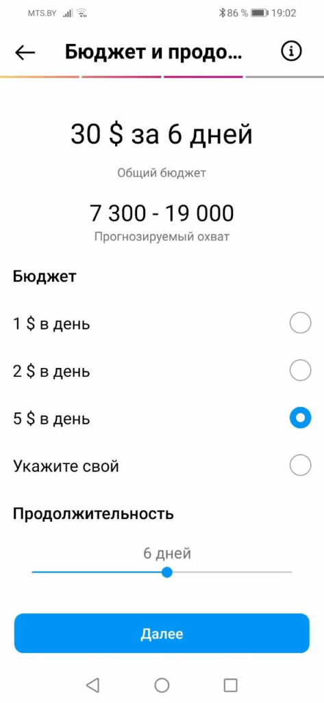 Осталось лишь задать приемлемый бюджет. Чем тот меньше, тем ниже охват. Также установите продолжительность, хотя бы три дня – за это время система сможет найти вашу аудиторию.