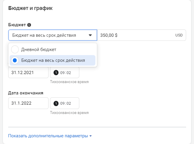 После этого задаем бюджет. Можно выбрать дневной или за все время кампании. Последний вариант лучше тем, что проще анализировать показатели, да и когда указанный период закочится, кампания остановится, а не продолжит мотать оставшиеся средства.