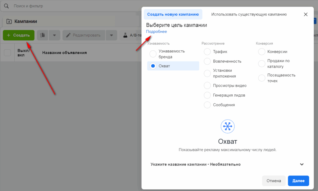 - Охват: реклама будет показываться максимальному числу людей. Цель подходит для рекламы какого-то мероприятия в маленьком городе, или если планируете показывать рекламу узкому кругу людей и хочется их максимально охватить.