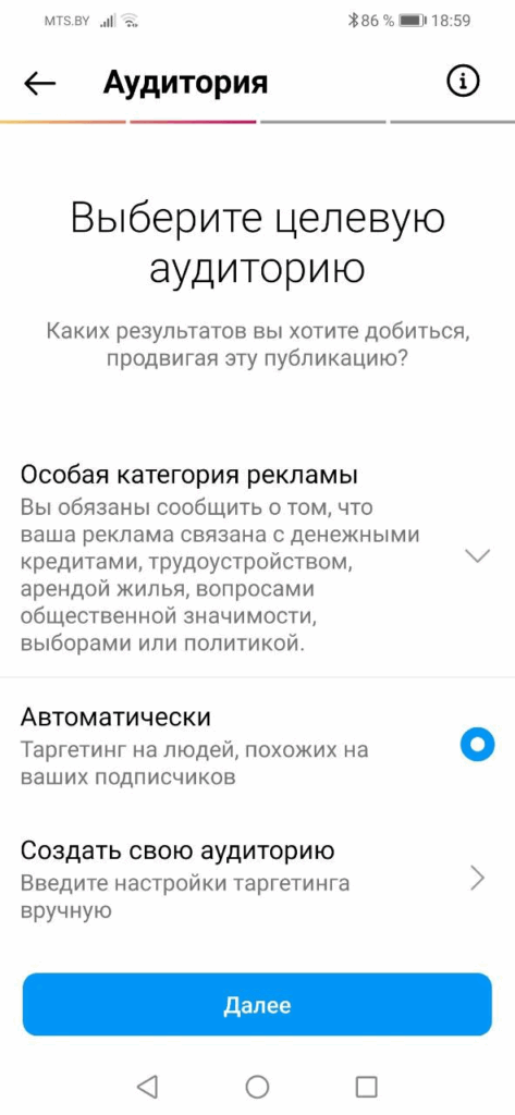 После этого вам следует указать аудиторию.