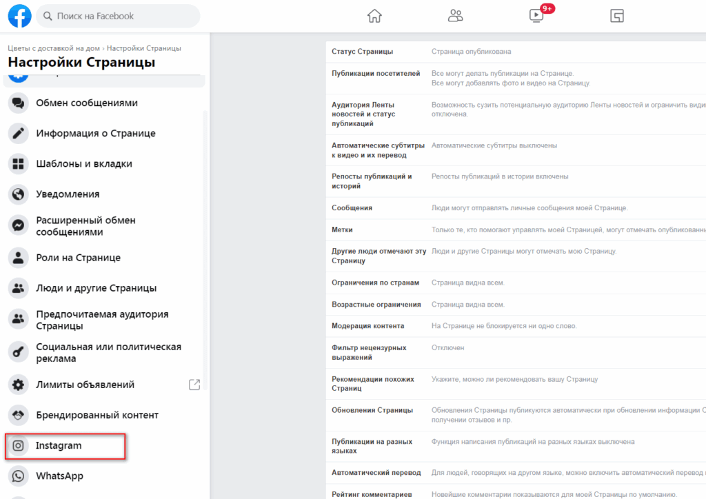 После этого нужно заполнить все данные, указав реальную компанию и сферу ее деятельности. После заполнения всех полей перейдите в «Управление страницы» (в левом поле) и нажмите «Настройки». Там выберите «Instagram» и подключите его.