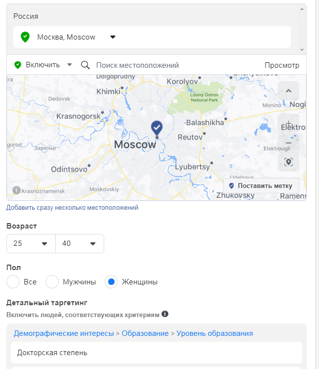 Настроек очень много, и они позволят задать точное описание пользователей, которым будет интересен ваш товар/услуга.