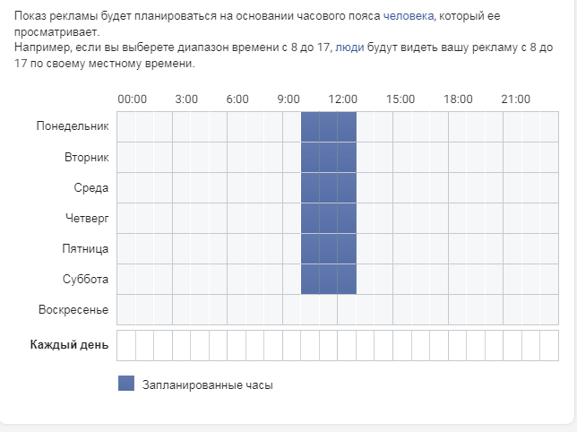 В дополнительных параметрах можно указать точные часы показа. Например, можно задать показ рекламы доставки обедов в офис в промежутке 10–12 часов дня, когда сотрудники во время кофе-брейков просматривают ленту.