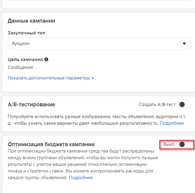 Когда выберете цель, вас перебросит в новое окно. Там вы дадите название новой кампании и сможете включить оптимизацию бюджета кампании. Эта настройка может повысить эффективность рекламы, если в аккаунте будет достаточно конверсий для обучения, но может и снизить ее. Если это маленькая кампания, есть смысл в начале кампании не включать оптимизацию.