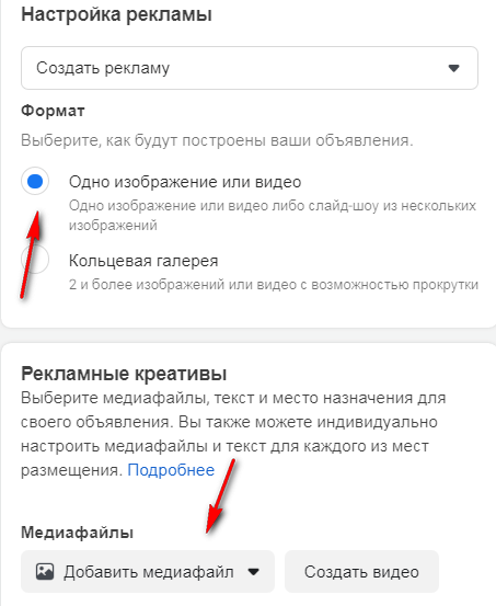 Первым делом нужно выбрать формат. Это может быть одно изображение или видео. Вы можете создать до 6 объявлений с разными изображениями, видео или слайд-шоу.