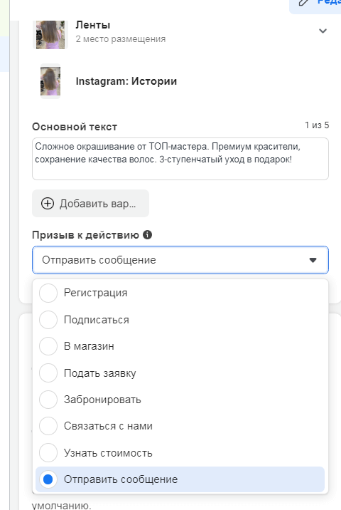 Далее нужно написать привлекательное объявление. Оно должно четко показывать выгоды вашего предложения. Можно добавить варианты текста. После этого следует выбрать вариант призыва к действию.