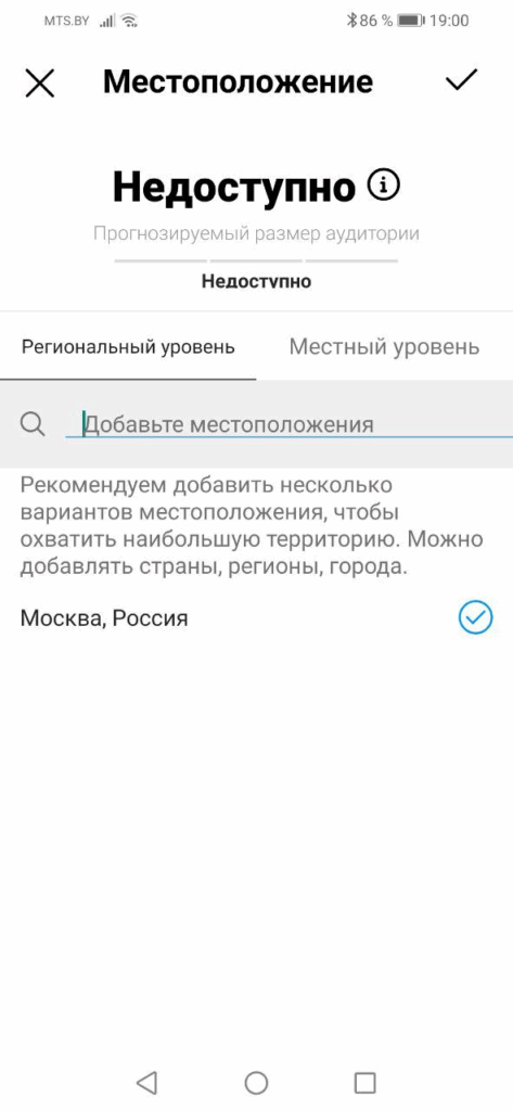 После вы можете указать гео аудитории, в пределах которого будет показываться реклама. Можно указать конкретный город (Региональный уровень) или задать радиус в диапазоне 1–30 км (Местный уровень).
