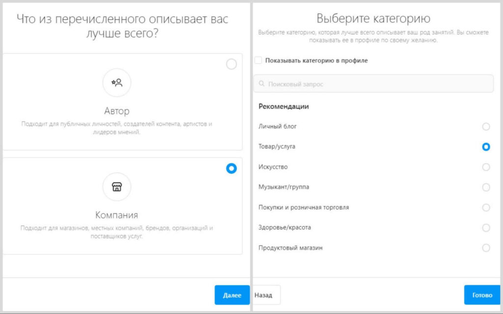 Если у вас аккаунт личный, его нужно перевести в бизнес. Для этого переходим в настройки и переключаемся на бизнес-профиль. После выбираем нужную категорию и сохраняем.