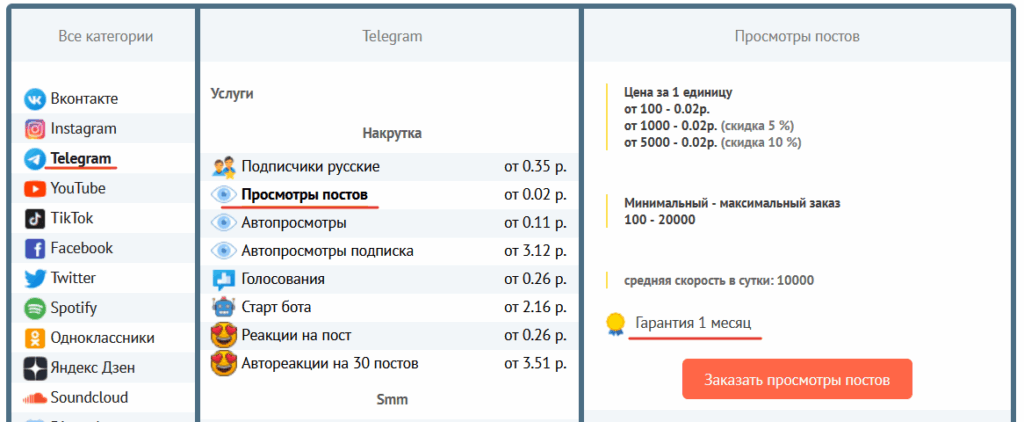 Этот сервис работает с огромным количеством соцсетей. Для Телеграма он предлагает просмотры и автопросмотры по цене от 0,02 р. Есть гарантия от списания в один месяц.