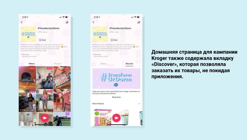 Когда бренды платят за хештег-челленджи, их хештеги продвигаются в течение нескольких дней и обычно сопровождаются микросайтом, где пользователи могут приобрести продукт бренда. Именно этим занималась продуктовая сеть Kroger, когда они запустили хештег-челлендж #TransformUrDorm во время сезона школьных покупок.