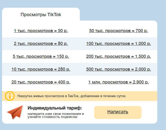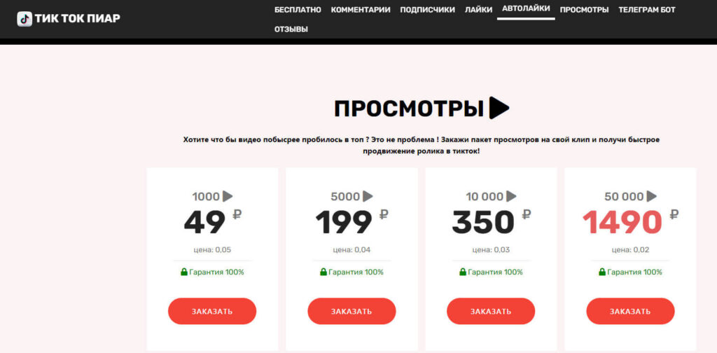 Платформа предлагает быстрые просмотры видео в большом количестве. Есть тариф с годовой гарантией и месячный пакет (то есть автопросмотры). Стоимость от 10 руб. за сотню просмотров. Продвинутые тиктокеры могут заказать сразу 5 млн в час.
