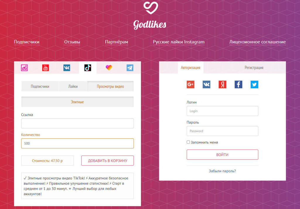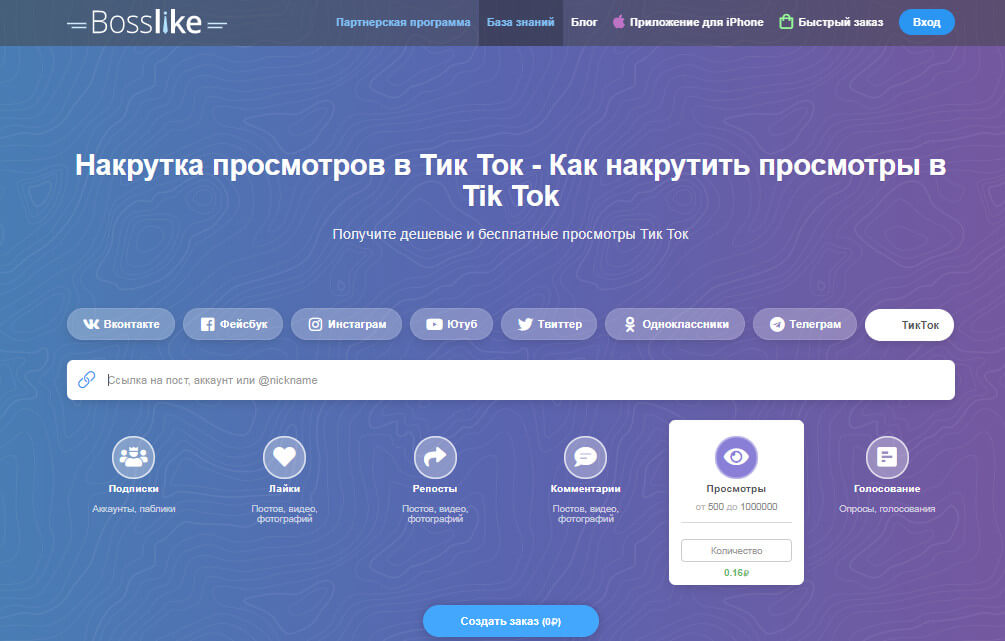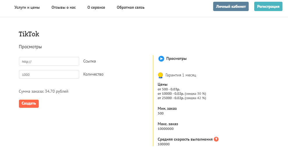 Сервис накрутки в разных соцсетях, включая TikTok. Тарифы недорогие, от 17,35 руб за 500 просмотров. Скорость накрутки зависит от раскрученности аккаунта и определяется автоматически.