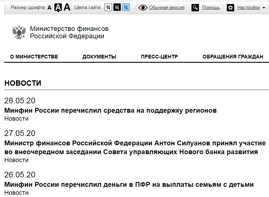Любому государственному сайту положено иметь версию для людей с ослабленным зрением. Она может иметь ограниченный функционал (минимальные настройки шрифта и цвета) или же расширенный, включающий встроенный диктор. За отсутствие данной версии грозит штраф в размере до 300 тыс. руб, снятие с должности или принудительные работы сроком до 5 лет.