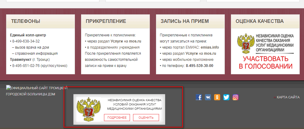 Медицинские учреждения оказывают услуги. В связи с этим на главной странице должен висеть баннер по независимой оценке качества оказания услуг. Он должен быть кликабельным и вести на анкету-опросник.