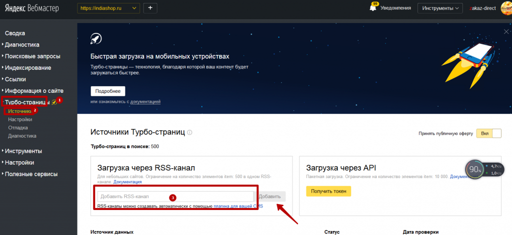 После создания RSS-выгрузки пройдите проверку в Яндекса Вебмастере