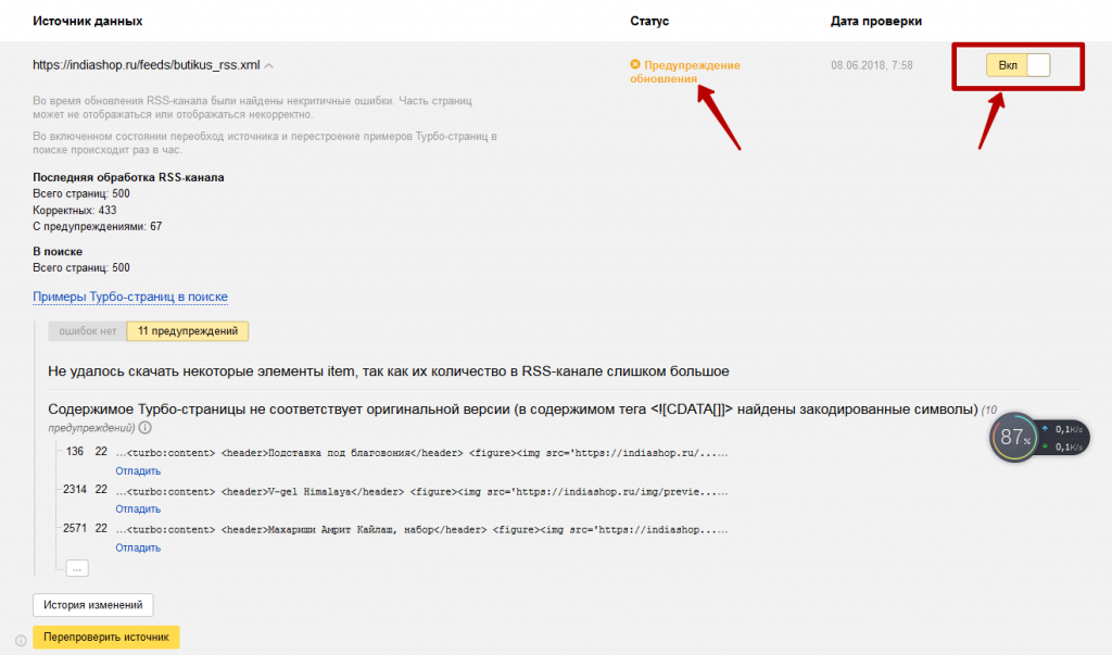 Вслед за прохождением проверки жмем ВКЛ – при выгрузке товаров возможны некоторые проблемы с теми или иными страницами, но большая масса выгрузится непременно: