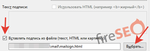 А если хотите создать подпись с изображениями, особенными стилями, дизайнерским оформлением, изображениями иконок соцсетей – то в настройках поставьте галочку напротив <Вставлять подпись из файла – текст, HTML или картинку> и выберите нужный файл на компьютере: