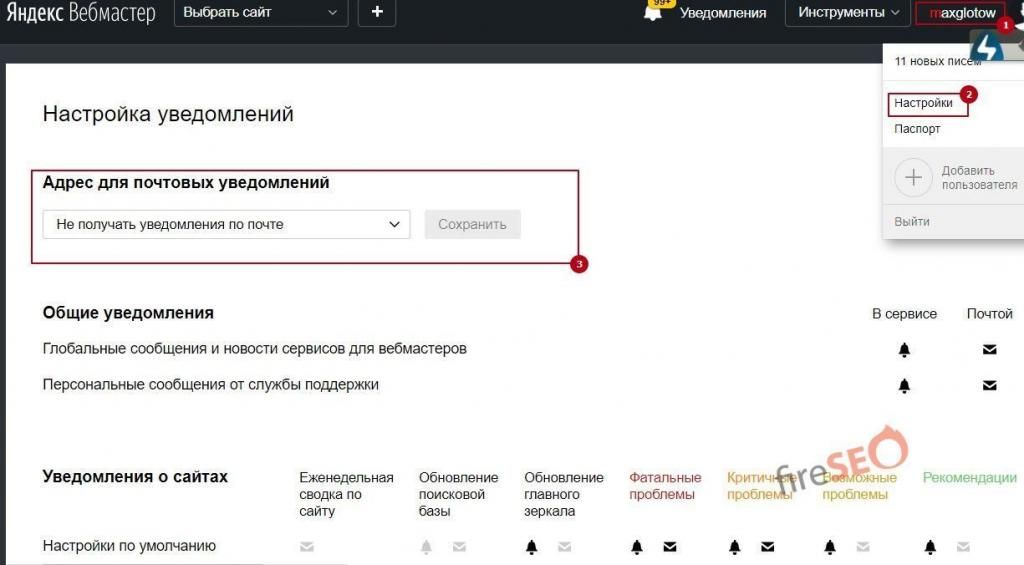2. В Яндекс. Вебмастере добавилась возможность настроить уведомления о состоянии вашего сайта, которые будут приходить на почту.