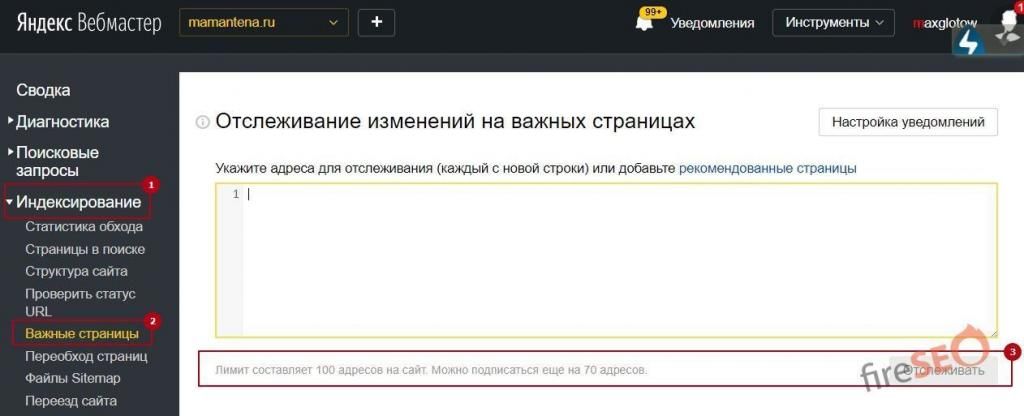 Рисунок: настройка отслеживания важных страниц с помощью яндекс вебмастера